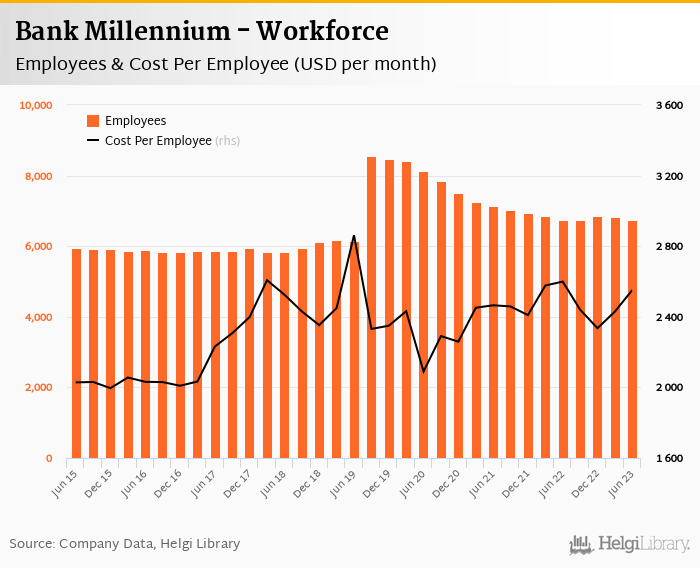 Comparing Bank Millennium with its closest peers, PKO BP had 25,300 employees and 959 branches in 2023-06-30, Pekao operated with 14,918 people and 581 branches and ING Bank Slaski had a network of 218 branches with 8,536 employees in 2023-06-30.