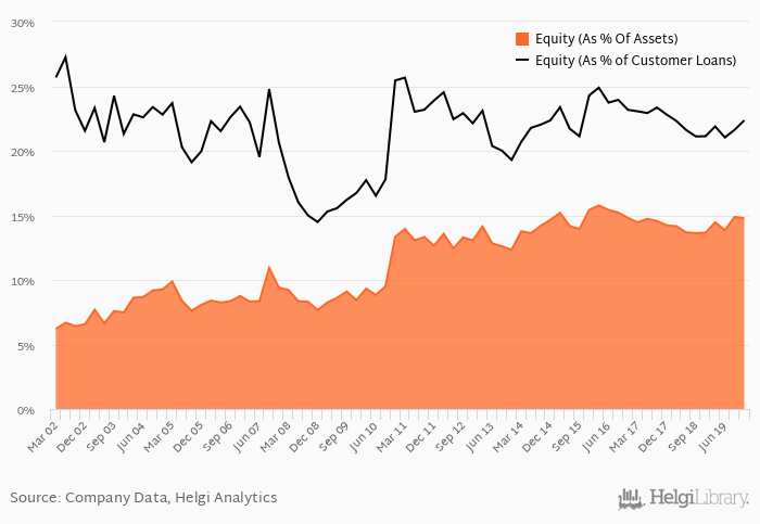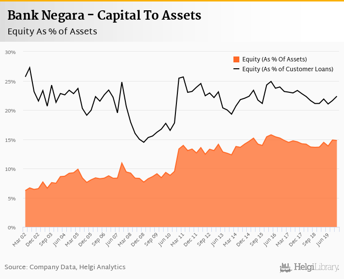 Bank Negara's Equity reached 14.8% of total assets in the 4Q2019, up from 13.7% for the previous year. As a share of net customer loans, the ratio amounted to 22.4% at the end of the fourth quarter of 2019.