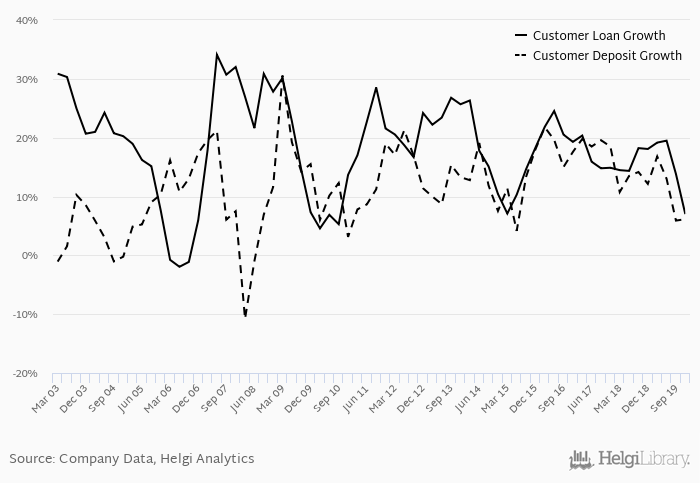 On the other hand, bank's customer deposit growth amounted to 6.14% at the end of 2019-12-31, down from 12.1% when compared to the previous year. Historically, the bank’s deposit growth reached an all time high of 30.5% in 2009-03-31 and an all time low of -10.8% in 2008-03-31. In the last decade, the average annual loan growth amounted to 12.5%.