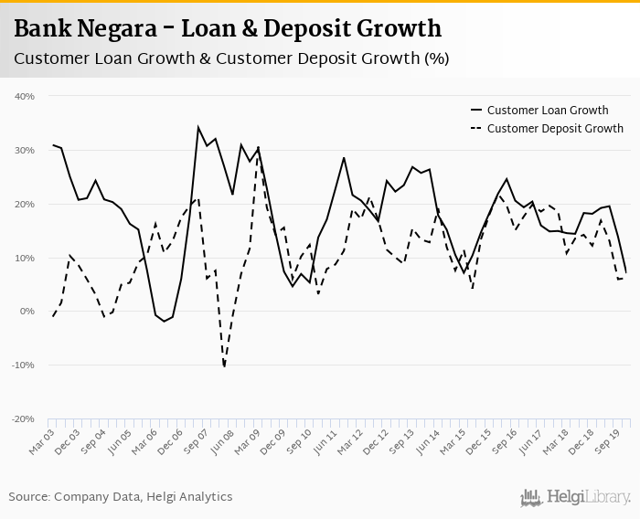 Bank Negara's customer loan growth reached 7.00% in 2019-12-31, down from 18.1% compared to the previous year. Historically, the bank’s loans growth reached an all time high of 34.1% in 2007-06-30 and an all time low of -1.95% in 2006-06-30. In the last decade, the average annual loan growth amounted to 17.2%.