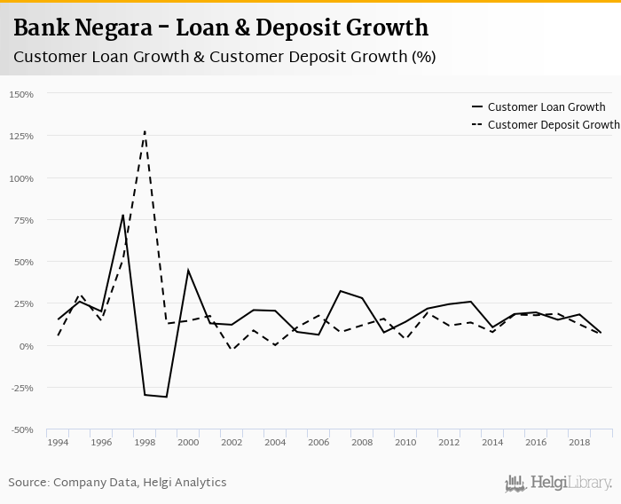 Bank Negara's customer loan growth reached 7.00% in 2019, down from 18.1% compared to the previous year. Historically, the bank’s loans growth reached an all time high of 77.6% in 1997 and an all time low of -31.1% in 1999. In the last decade, the average annual loan growth amounted to 17.2%.