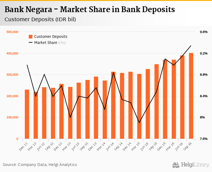 Bank Negara's customer deposits reached IDR 401,877 bil in 2016-09-30, up 2.65% compared to the previous year.