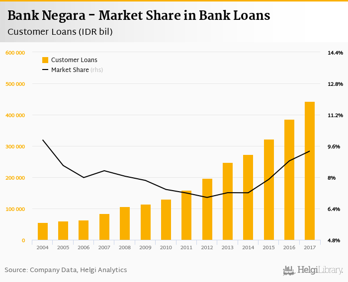 Bank Negara accounted for 9.34% of all customer loans issued in Indonesia at the end of 2017. Historically, the bank’s market share in customer loans reached an all time high of 9.92% in 2004 and an all time low of 6.97% in 2012.