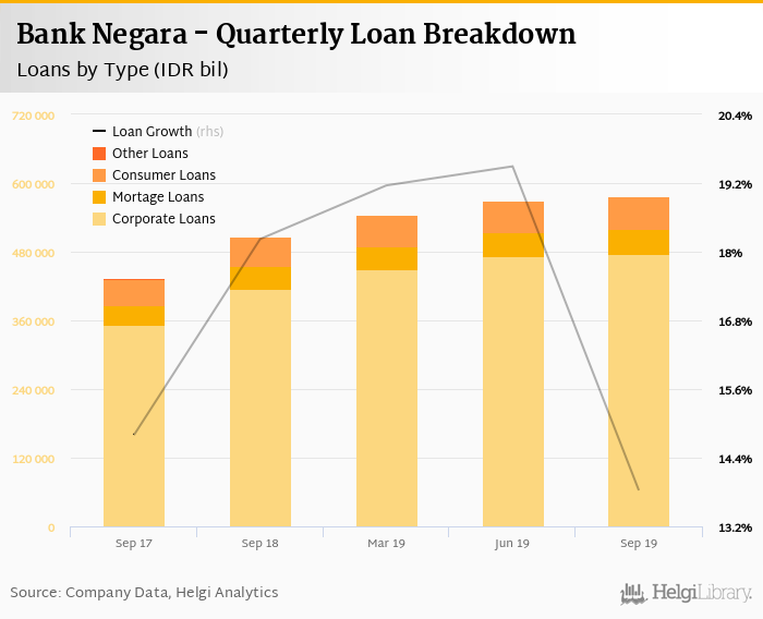 Bank Negara's loans reached IDR 576,822 bil in the third quarter of 2019, up from IDR 569,869 bil when compared to the previous quarter and up from IDR 507,488 bil when compared to the same period of last year. Historically, the bank’s loans reached an all time high of IDR 576,822 bil in 3Q2019 and an all time low of IDR 433,520 bil in 3Q2017.