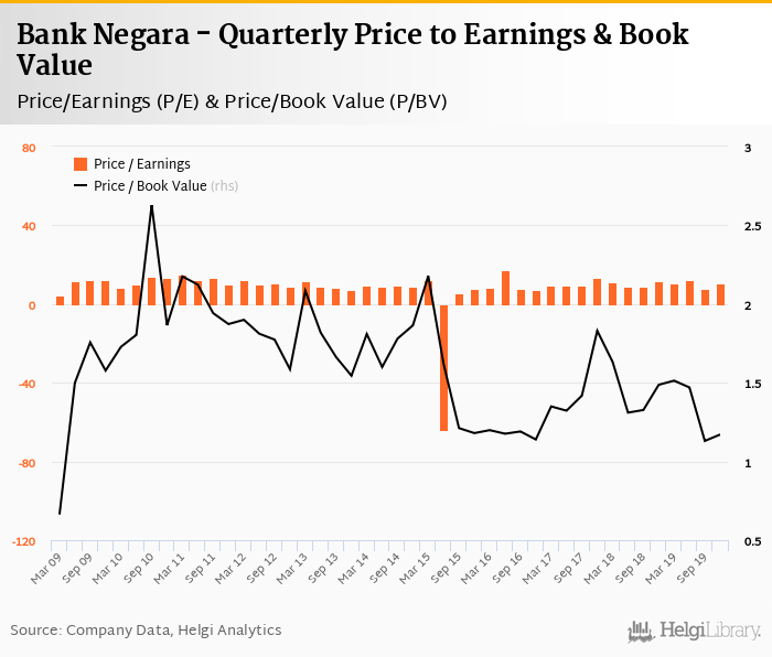 At the end of 4Q2019, the bank traded at price to earnings of 10.7x. Within the last five years, the multiple reached an all time high of 17.5x in 2Q2016 and an all time low of -63.8x in 2Q2015 with an average of 6.22x.