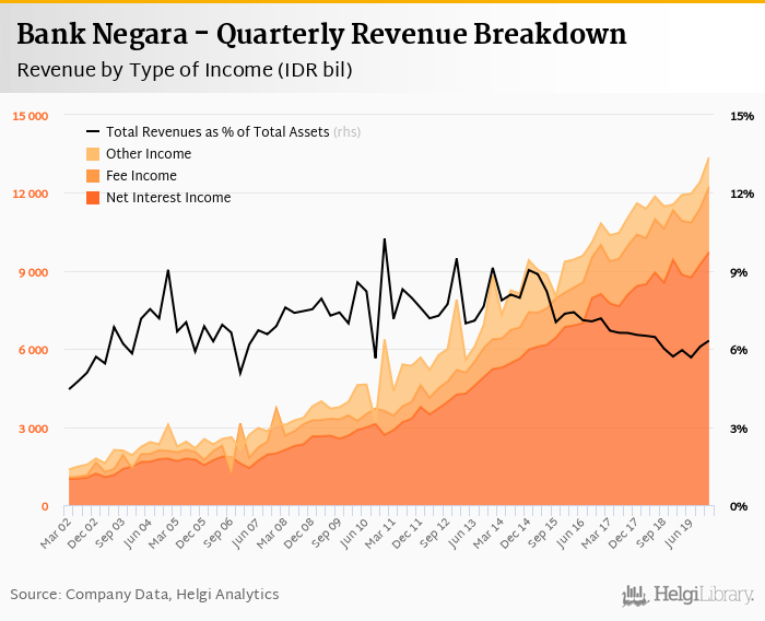 Bank Negara generated total banking revenues of IDR 13,365 bil in the fourth quarter of 2019, up 15.8% when compared to the same period of last year and 7.69% when compared to the previous quarter.