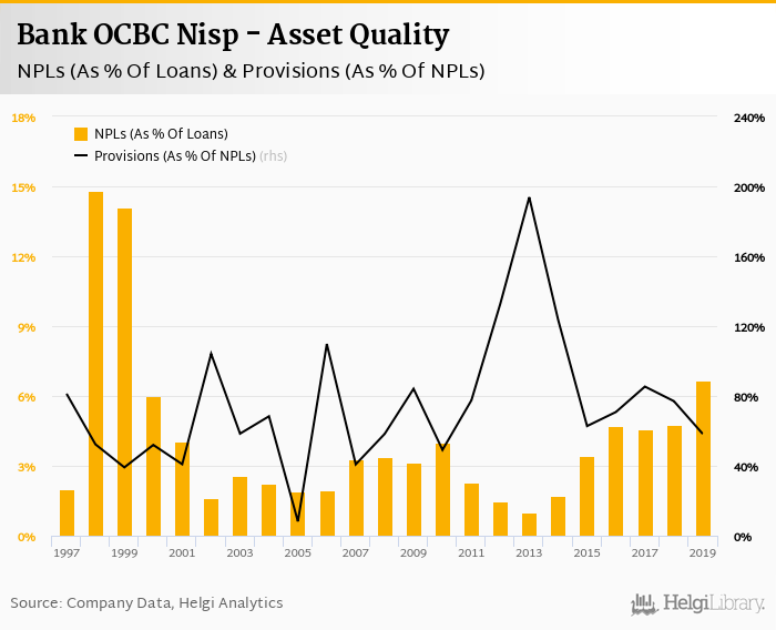 Bank OCBC Nisp's non-performing loans reached 6.65% of total loans at the end of 2019, up from 4.78% compared to the previous year. Historically, the NPL ratio hit an all time high of 14.8% in 1998 and an all time low of 1.02% in 2013.