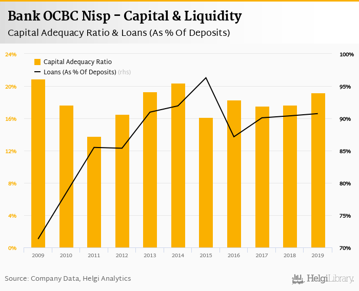 Bank OCBC Nisp's capital adequacy ratio reached 19.2% at the end of 2019, up from 17.6% compared to the previous year. Historically, the bank’s capital ratio hit an all time high of 20.9% in 2009 and an all time low of 13.8% in 2011.