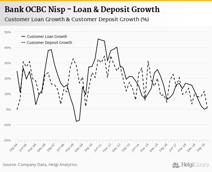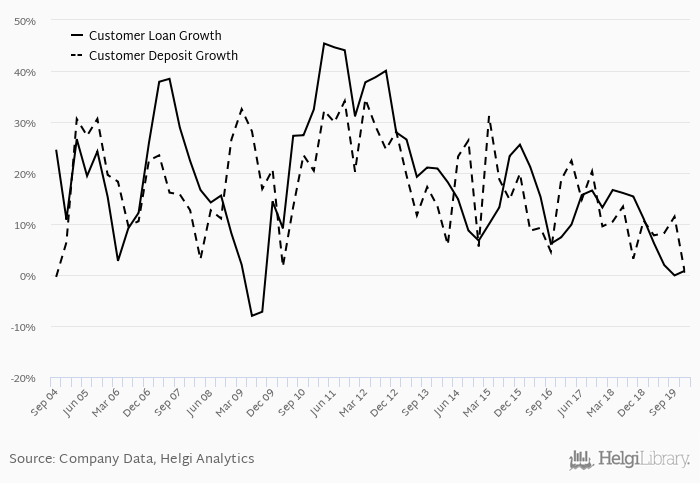 On the other hand, bank's customer deposit growth amounted to 0.447% at the end of 2019-12-31, down from 10.7% when compared to the previous year. Historically, the bank’s deposit growth reached an all time high of 34.5% in 2012-03-31 and an all time low of -0.381% in 2004-09-30. In the last decade, the average annual loan growth amounted to 14.4%.