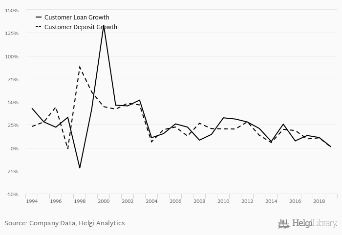 On the other hand, bank's customer deposit growth amounted to 0.447% at the end of 2019, down from 10.7% when compared to the previous year. Historically, the bank’s deposit growth reached an all time high of 87.6% in 1998 and an all time low of -1.39% in 1997. In the last decade, the average annual loan growth amounted to 14.4%.