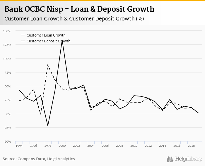 Bank OCBC Nisp's customer loan growth reached 0.833% in 2019, down from 11.1% compared to the previous year. Historically, the bank’s loans growth reached an all time high of 133% in 2000 and an all time low of -22.2% in 1998. In the last decade, the average annual loan growth amounted to 17.2%.