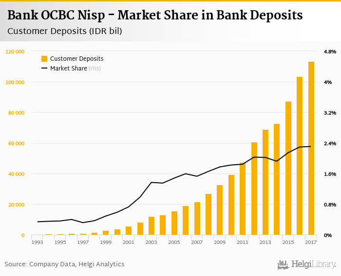 Bank OCBC Nisp accounted for 2.31% of all customer deposits taken by banks in Indonesia at the end of 2017. Historically, the bank’s market share in customer deposits reached an all time high of 2.31% in 2017 and an all time low of 0.315% in 1997.
