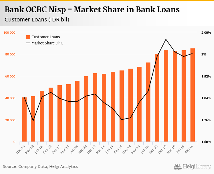 Bank OCBC Nisp's customer loans reached IDR 85,413 bil in 2016-09-30, up 1.90% compared to the previous year.