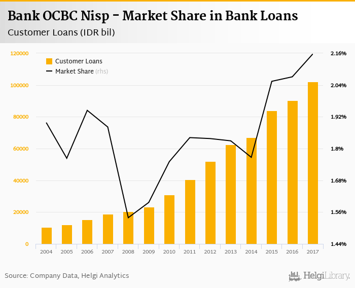 Bank OCBC Nisp accounted for 2.16% of all customer loans issued in Indonesia at the end of 2017. Historically, the bank’s market share in customer loans reached an all time high of 2.16% in 2017 and an all time low of 1.54% in 2008.