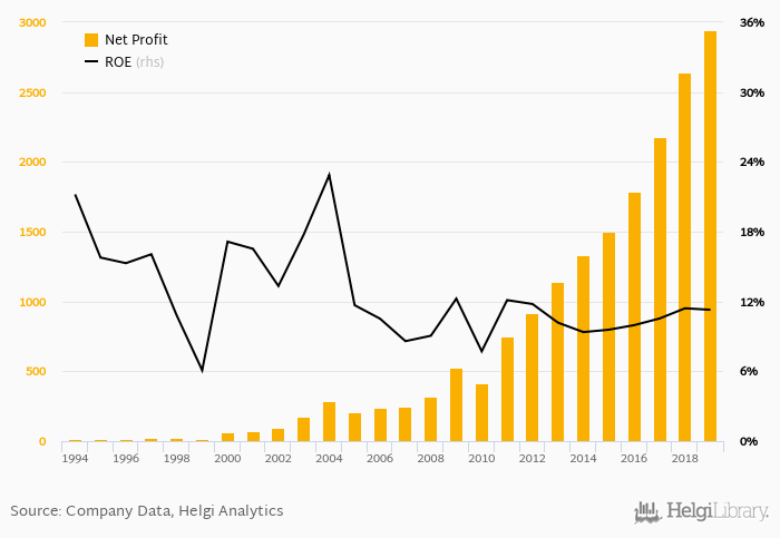 Historically, the bank’s net profit reached an all time high of IDR 2,940 bil in 2019 and an all time low of IDR 13.5 bil in 1994. The average profit in the last five years amounted to IDR 2,209 bil.