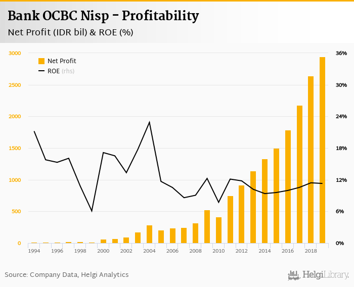 Bank OCBC Nisp made a net profit of IDR 2,940 bil in 2019, up 11.5% compared to the previous year. This implies a return on equity of 11.3%.