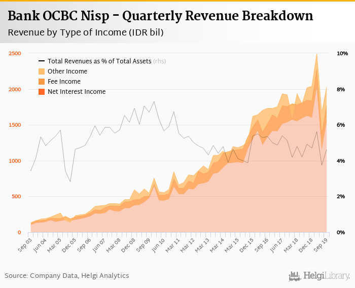 Bank OCBC Nisp generated total banking revenues of IDR 2,028 bil in the third quarter of 2019, up 0.567% when compared to the same period of last year and 21.5% when compared to the previous quarter.
