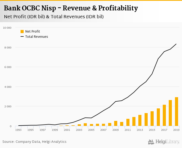 Bank OCBC Nisp made a net profit of IDR 2,940 bil under revenues of IDR 8,329 bil in 2019, up 11.5% and 7.01% respectively compared to the previous year.
