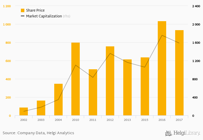 Since the end of 2012, the stock has appreciated by 23.4 % implying an annual average growth of 4.30 %. In absolute terms, the value of the company rose by USD 226 mil.