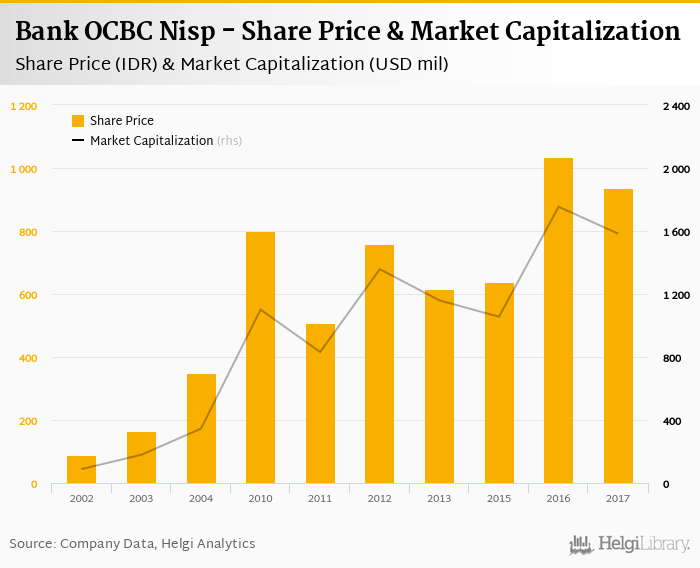 Bank OCBC Nisp stock traded at IDR 938 per share at the end of 2017 implying a market capitalization of USD 1,583 mil.