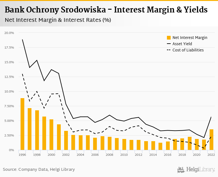 Bank Ochrony Srodowiska's net interest margin amounted to 3.56% in 2022, up from 1.83% compared to the previous year.