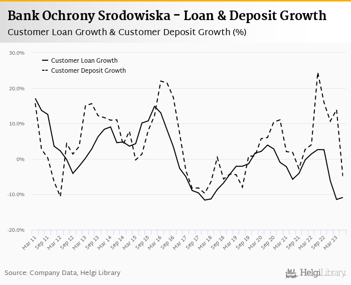 Bank Ochrony Srodowiska's customer loan growth reached -10.9% in 2023-06-30, down from 2.65% compared to the previous year. Historically, the bank’s loans growth reached an all time high of 17.1% in 2011-03-31 and an all time low of -11.6% in 2017-12-31. In the last decade, the average annual loan growth amounted to -0.928%.