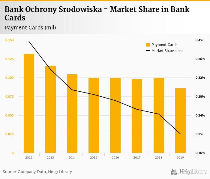 Bank Ochrony Srodowiska therefore accounted for 0.201% of all bank cards issued by banks in Poland at the end of 2019. Historically, the bank’s market share in payment cards reached an all time high of 0.397% in 2012 and an all time low of 0.201% in 2019.