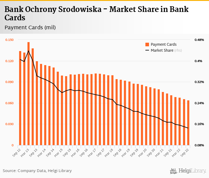 Bank Ochrony Srodowiska therefore accounted for 0.145% of all bank cards issued by banks in Poland at the end of 2022-09-30. Historically, the bank’s market share in payment cards reached an all time high of 0.438% in 2013-03-31 and an all time low of 0.145% in 2022-09-30.