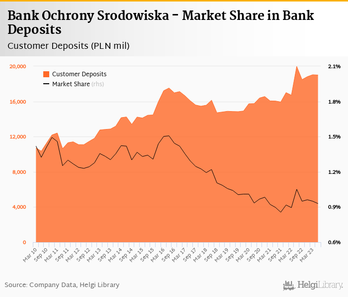 Bank Ochrony Srodowiska's customer deposits reached PLN 19,007 mil in 2023-06-30, down 0.168% compared to the previous year.