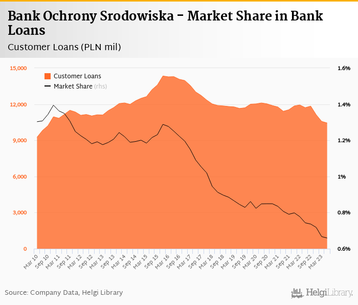 Bank Ochrony Srodowiska's customer loans reached PLN 10,442 mil in 2023-06-30, down 1.23% compared to the previous year.