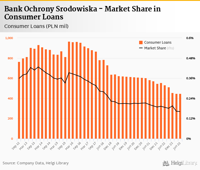 Bank Ochrony Srodowiska's consumer loans reached PLN 447 mil in 2023-06-30, down 0.153% compared to the previous year.