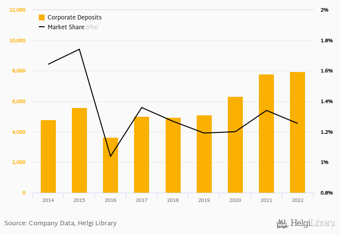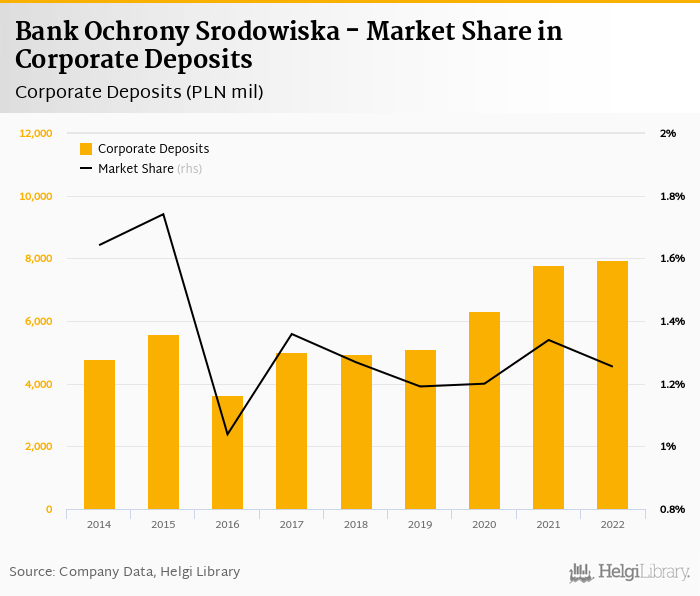 Bank Ochrony Srodowiska accounted for 1.25% of all corporate deposits taken by banks in Poland at the end of 2022. Historically, the bank’s market share in corporate deposits reached an all time high of 1.74% in 2015 and an all time low of 1.04% in 2016.
