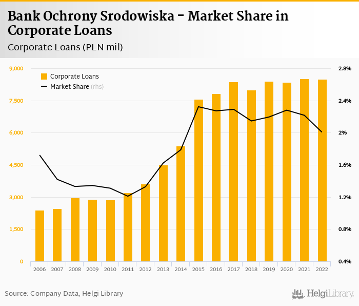 Bank Ochrony Srodowiska accounted for 2.01% of all corporate loans issued in Poland at the end of 2022. Historically, the bank’s market share in corporate loans reached an all time high of 2.32% in 2015 and an all time low of 1.21% in 2011.