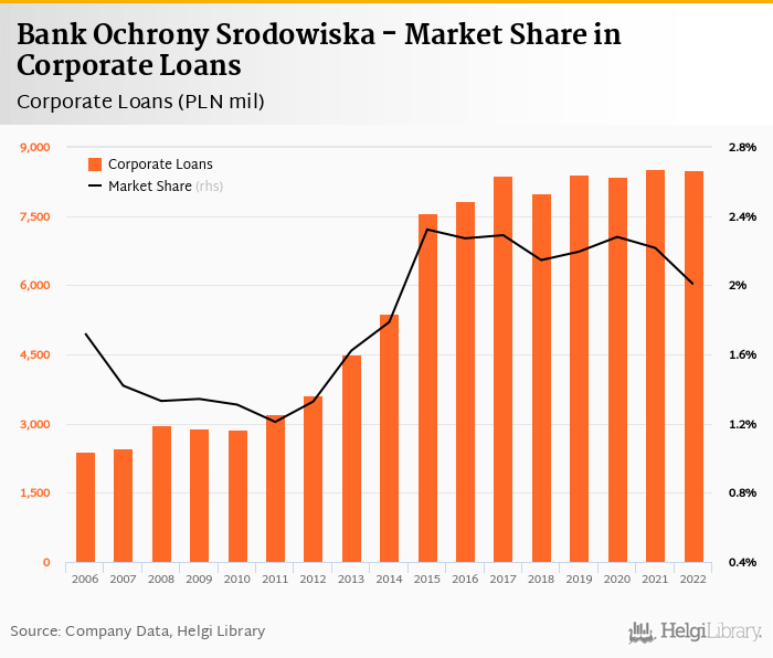 Bank Ochrony Srodowiska accounted for 2.01% of all corporate loans issued in Poland at the end of 2022. Historically, the bank’s market share in corporate loans reached an all time high of 2.32% in 2015 and an all time low of 1.21% in 2011.