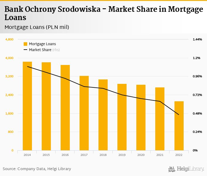 Bank Ochrony Srodowiska's mortgage loans reached PLN 2,132 mil in 2022, down 21.8% compared to the previous year.