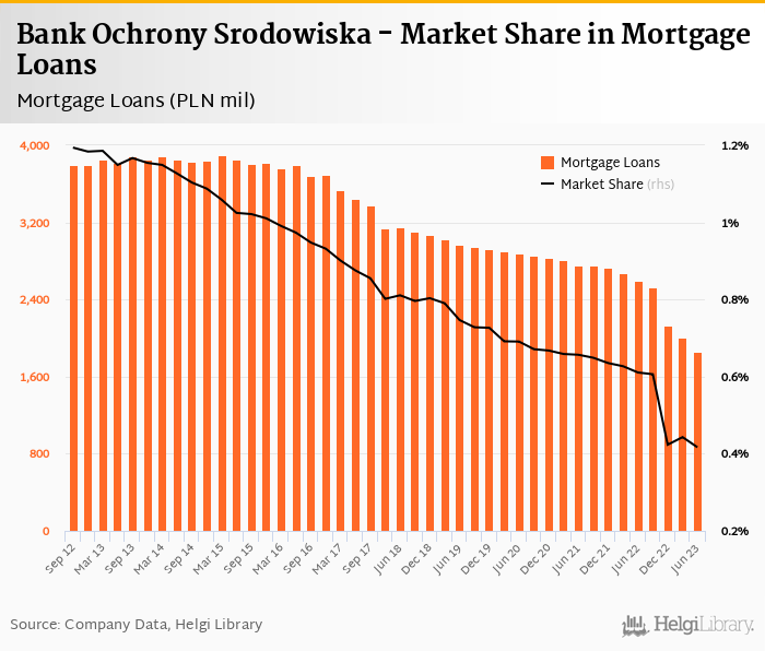 Bank Ochrony Srodowiska's mortgage loans reached PLN 1,856 mil in 2Q2023, down 7.49% compared to the previous year.