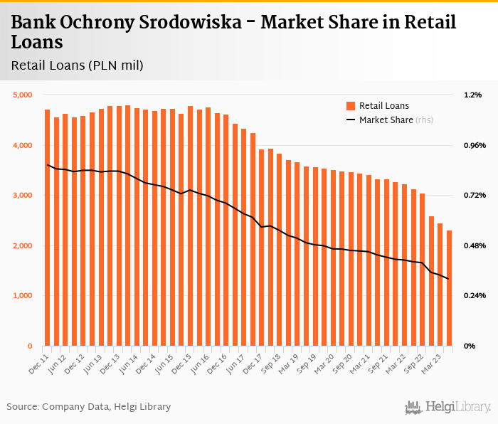 Bank Ochrony Srodowiska's retail loans reached PLN 2,303 mil in the second quarter of 2023, down 6.15% compared to the previous year.