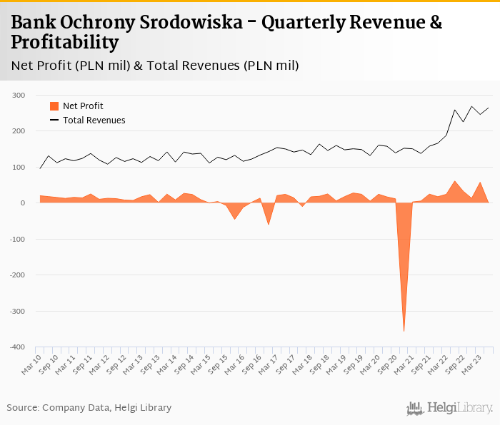 Bank Ochrony Srodowiska made a net profit of PLN -1.24 mil under revenues of PLN 264 mil in the second quarter of 2023, down 102% and up 2.19% respectively when compared to the same period last year.