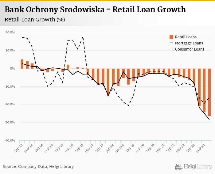 Bank Ochrony Srodowiska's retail loans reached PLN 2,303 mil at the end of 2023-06-30, down 6.15% compared to the previous year. In the last decade, the average annual loan growth amounted to 0%.