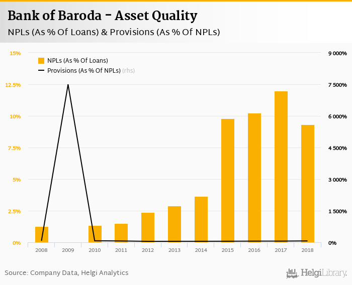 Bank of Baroda's non-performing loans reached 9.33% of total loans at the end of 2018, down from 12.0% compared to the previous year. Historically, the NPL ratio hit an all time high of 12.0% in 2017 and an all time low of 0.013% in 2009.