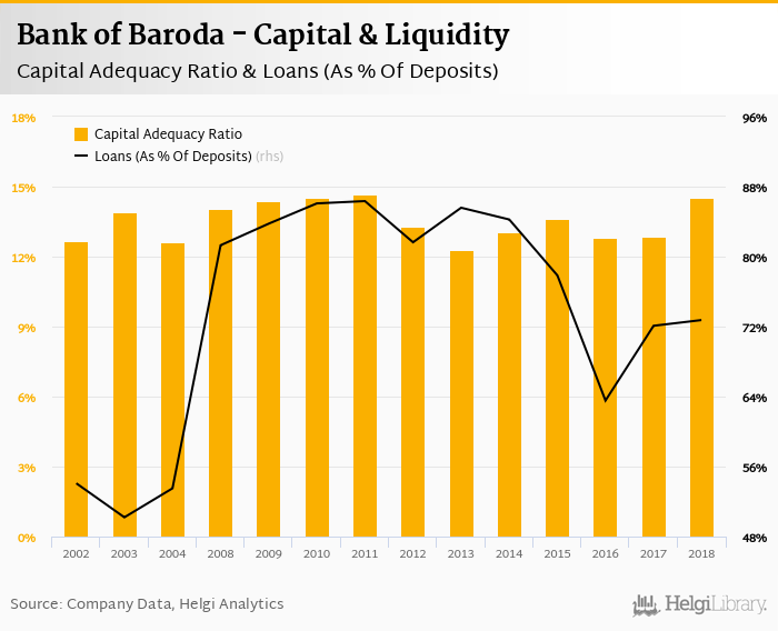 Bank of Baroda's capital adequacy ratio reached 14.5% at the end of 2018, up from 12.9% compared to the previous year. Historically, the bank’s capital ratio hit an all time high of 14.7% in 2011 and an all time low of 12.3% in 2013.