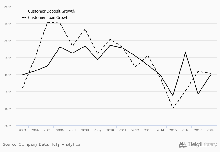 On the other hand, bank's customer deposit growth amounted to 9.57% at the end of 2018, up from -1.59% when compared to the previous year. Historically, the bank’s deposit growth reached an all time high of 27.1% in 2010 and an all time low of -2.71% in 2015. In the last decade, the average annual loan growth amounted to 14.0%.