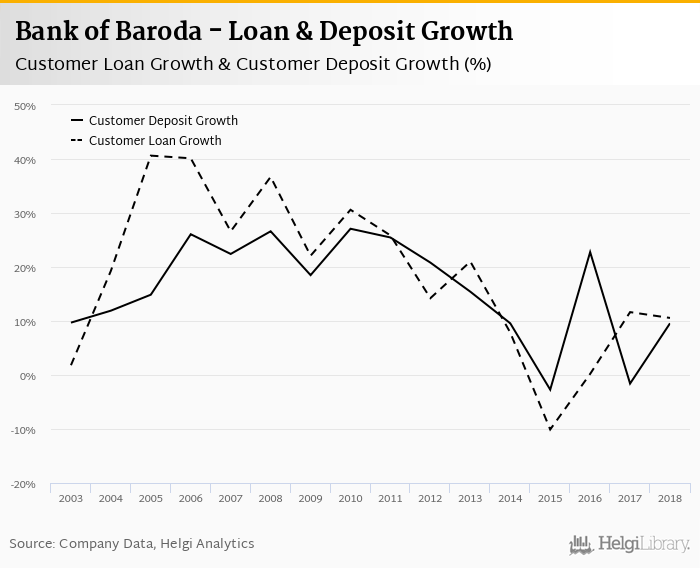 Bank of Baroda's customer loan growth reached 10.6% in 2018, down from 11.6% compared to the previous year. Historically, the bank’s loans growth reached an all time high of 40.6% in 2005 and an all time low of -10.1% in 2015. In the last decade, the average annual loan growth amounted to 12.8%.