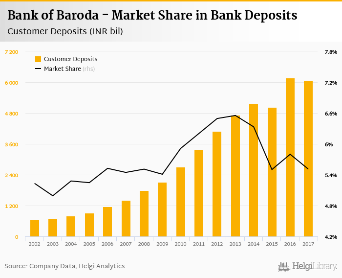Bank of Baroda accounted for 5.51% of all customer deposits taken by banks in India at the end of 2017. Historically, the bank’s market share in customer deposits reached an all time high of 6.55% in 2013 and an all time low of 4.99% in 2003.