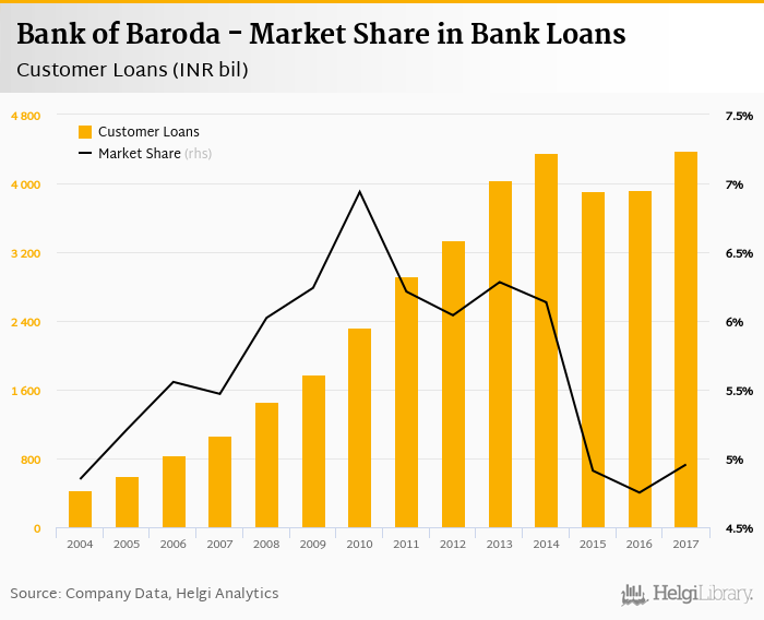 Bank of Baroda accounted for 4.96% of all customer loans issued in India at the end of 2017. Historically, the bank’s market share in customer loans reached an all time high of 6.94% in 2010 and an all time low of 4.75% in 2016.