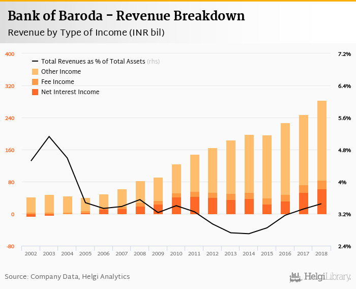 Bank of Baroda generated total banking revenues of INR 283 bil in 2018, up 14% compared to the previous year.