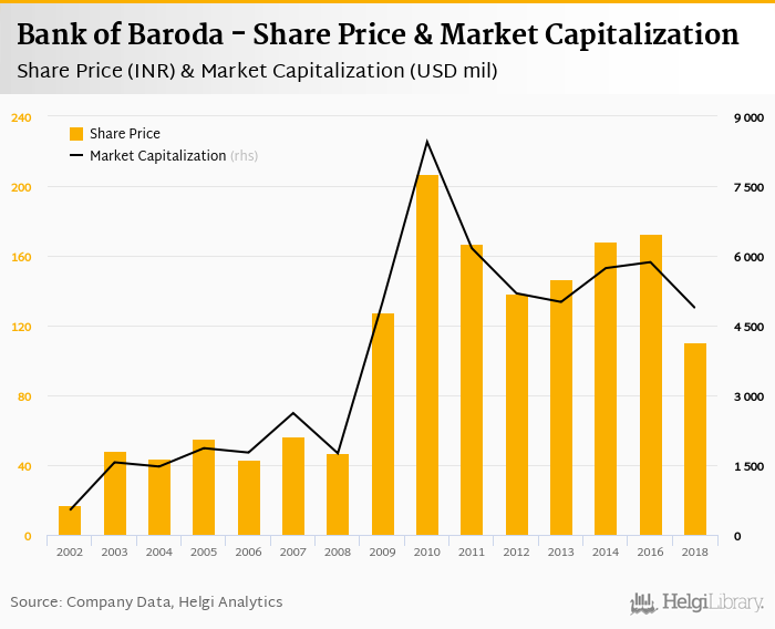 Bank of Baroda stock traded at INR 111 per share at the end of 2018 implying a market capitalization of USD 4,877 mil.