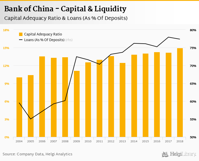 Bank of China's capital adequacy ratio reached 15.0% at the end of 2018, up from 14.2% compared to the previous year. Historically, the bank’s capital ratio hit an all time high of 15.0% in 2018 and an all time low of 10.0% in 2004.