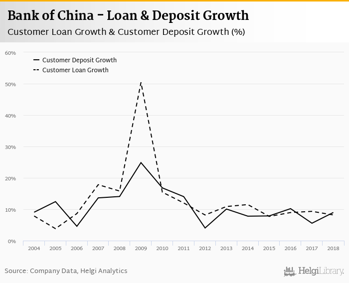Bank of China's customer loan growth reached 8.19% in 2018, down from 9.33% compared to the previous year. Historically, the bank’s loans growth reached an all time high of 50.4% in 2009 and an all time low of 3.82% in 2005. In the last decade, the average annual loan growth amounted to 13.7%.