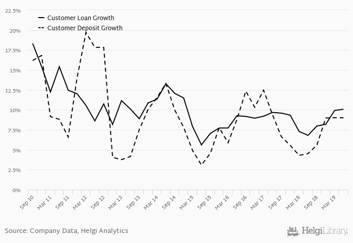 On the other hand, bank's customer deposit growth amounted to 9.00% at the end of 2019-06-30, up from 4.52% when compared to the previous year. Historically, the bank’s deposit growth reached an all time high of 19.7% in 2012-03-31 and an all time low of 3.09% in 2015-06-30. In the last decade, the average annual loan growth amounted to 0%.